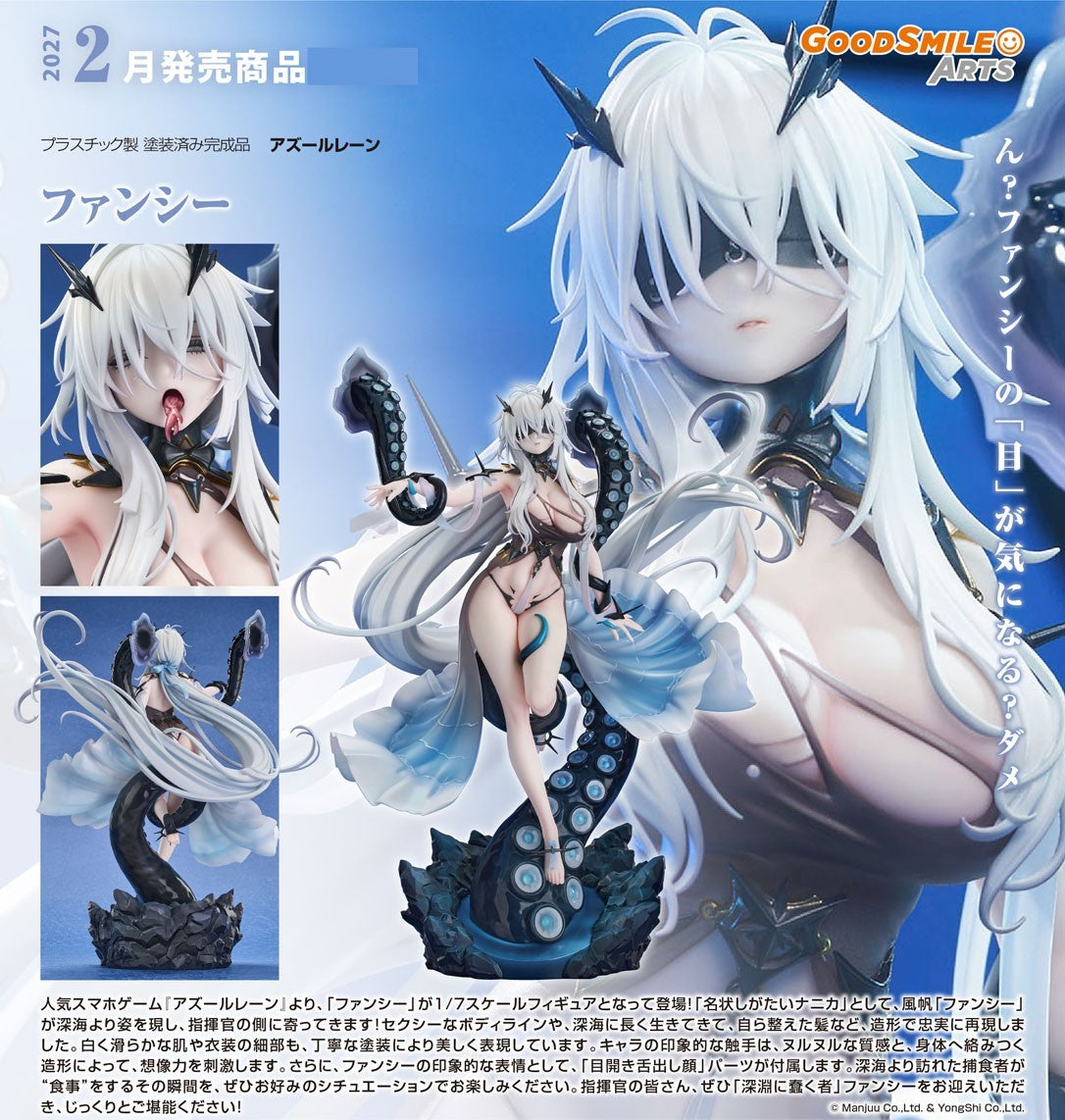 From the popular mobile game "Azur Lane" comes a 1/7 scale figure of Fancy! The Indescribable Something, Fancy the sailing frigate, is making her way to the Commander's collection! Her alluring physique and wispy long hair have been faithfully captured in figure form. Details such as her smooth white skin and outfit have been painted with the utmost care. The curls and slimy texture of her iconic tentacles have been realistically brought to life. An open-eyed face with tongue out parts is also included for displaying Fancy just moments before she "inhales" her prey. Commander, be sure to add Fancy to your collection!