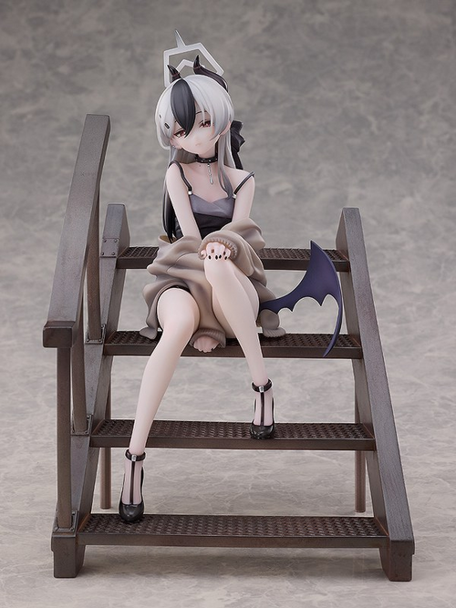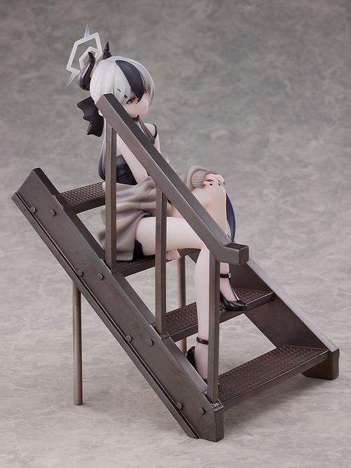 From the popular game "Blue Archive" comes a 1/7 scale figure of Kayoko, a member of Handy Solver 68! The figure features Kayoko with her long monochromatic hair tied up with a black ribbon, and a black-and-gray camisole dress that shows off her delicate physique. Kayoko's simple yet sophisticated attire accentuates her calm and composed personality. The special staircase base evokes a moment spent with Sensei in the memorial lobby, with the sunset behind. Sitting atop the stairs with her hands on her knees, the figure is based on Kayoko in a relaxed pose. Details such as her half-worn cardigan and soft purple wing are also included. Her gentle expression is captivates whoever lays their eyes on her, with a hint of playfulness. The mole on her collarbone, her earrings, choker and her black nails have all been carefully brought to life in figure form. Her mature charm is apparent in every detail. A smiling face part is also included for a different display option. Enjoy seeing different sides of Kayoko with the use of the interchangeable face part. Be sure to add this figure of Kayoko to your collection.